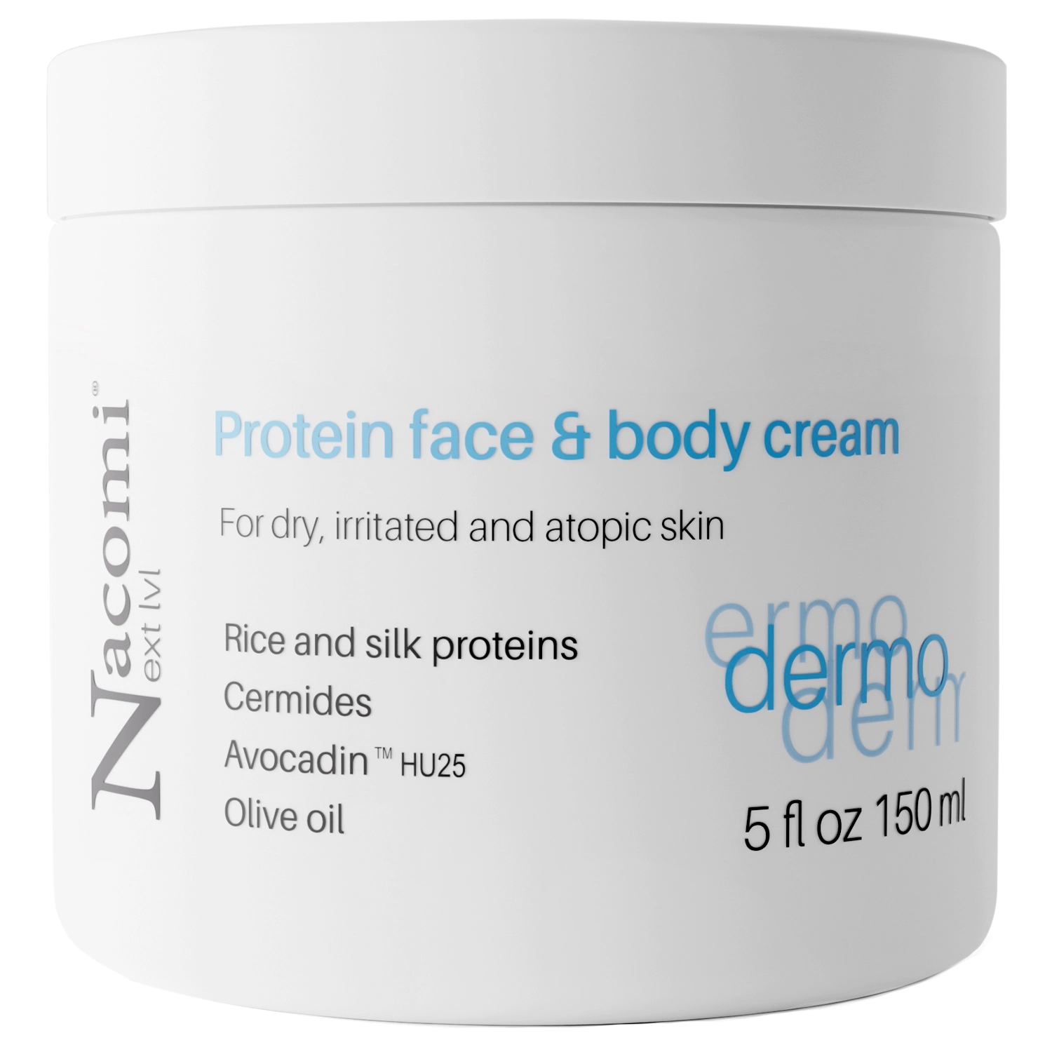 Nacomi - Dermo - Krēms ar Proteīniem Sausai un Atopiskai Sejas un Ķermeņa Ādai - krēms ļoti jutīgai sejas un ķermeņa ādai, tai skaitā sausai un atopiskai ādai. Tā sastāvā ir maiga olīveļļa un šī sviests, kas baro ādu un palīdz novērst mitruma zudumu. Keramīdi un hidrolizēti proteīni atjauno bojāto hidrolipīdu barjeru, nodrošinot ilgstošu un efektīvu mitrināšanu. Papildus formulā iekļautas nomierinošas un pretiekaisuma aktīvās vielas - niacinamīds, alantoīns un E vitamīns. Visa formula ir veidota no dabiskas izcelsmes sastāvdaļām.