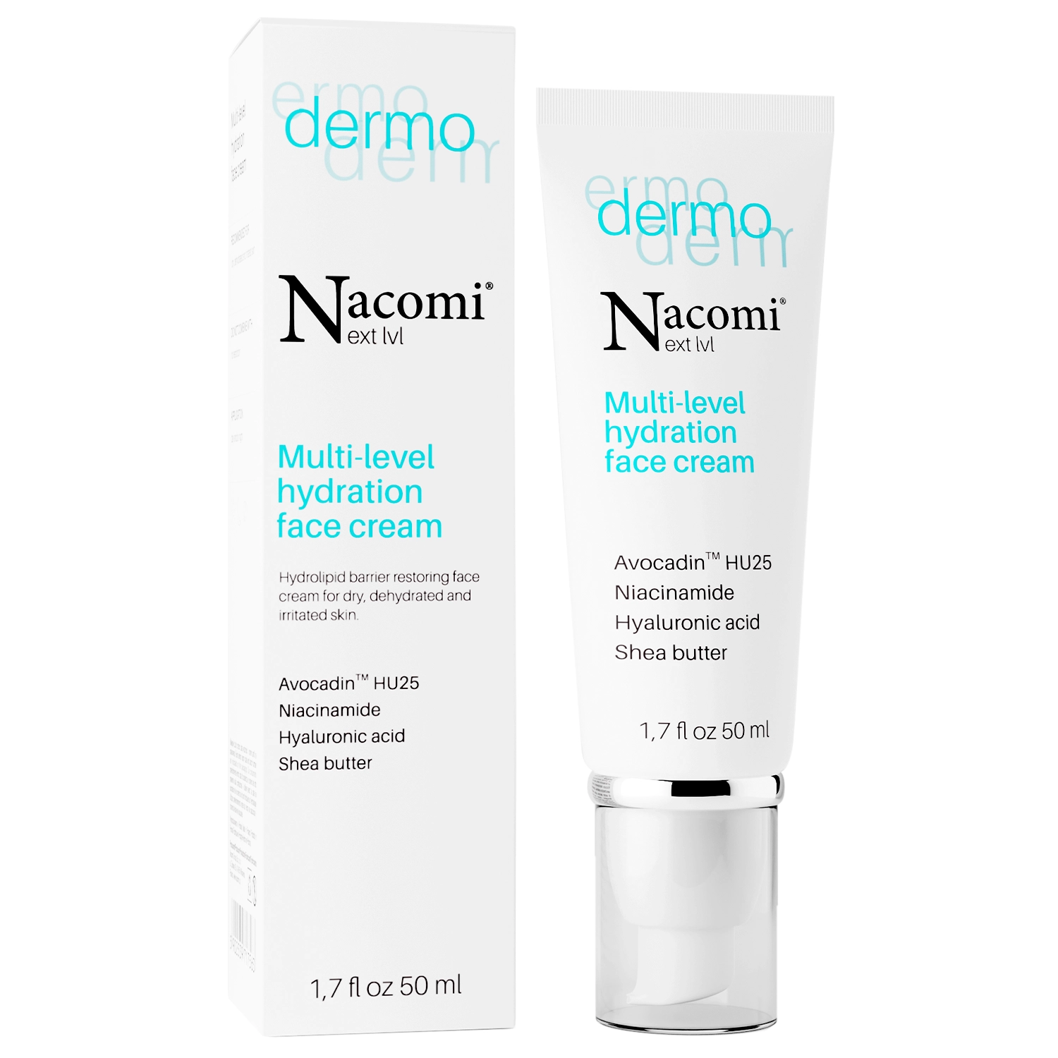Nacomi - Dermo - Daudzlīmeņu Intensīvi Mitrinošs Krēms - krēms sausai un dehidrētai sejas ādai, radīts, lai intensīvi un ilgstoši mitrinātu, sniedzot atvieglojumu ādai. Tā sastāvā ir daudz mitrinošo vielu, piemēram, trehaloze un urīnviela. Turklāt formulā ietilpst avokado eļļa un 4 hialuronskābes formas, kas veido aizsargkārtiņu uz ādas virsmas, novēršot pārmērīgu ūdens iztvaikošanu no epidermas un vienlaikus uzlabojot ādas elastību un tvirtumu. Visa formula ir veidota no dabiskas izcelsmes sastāvdaļām.