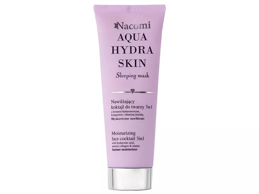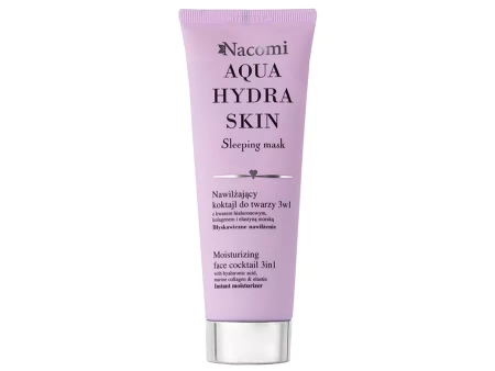 Nacomi - Aqua Hydra Skin - Sleeping Mask - Tūlītēja Mitrināšana - 3-in-1 Mitrinošs Sejas Kokteilis - mitrinoša krēma maska sausai ādai. Kokteiļa sastāvā ir saldo mandeļu eļļa un inku inči eļļa, kas rūpējas par pareizu ādas mitrināšanu, baro to un padara ādu mīkstu un elastīgu. Pantenola piedeva nomierina un atvieglo jebkādu kairinājumu, bet E vitamīnam ir spēcīga antioksidanta iedarbība. Produktu var lietot kā masku, nakts krēmu vai serumu. Tas padara ādu maigu un gludu. Visa produkta receptūra tika izveidota no dabīgas izcelsmes izejvielām.