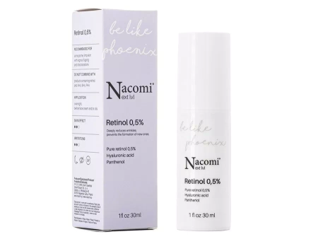Nacomi - Next Level - Retinol 0,5% - Serums ar 0,5% Retinolu - serums ar 0,5% A vitamīna retinolu. Šī sastāvdaļa ir pazīstama ar savām spēcīgajām pretnovecošanās īpašībām. Retinols spēj stimulēt fibroblastus kolagēna ražošanai, kā rezultātā palielinās ādas tvirtums un izlīdzinās grumbiņas. Sniedz atbalstu cīņā pret akni un regulē sebuma sekrēciju. Četru dažāda lieluma hialuronskābes formu pievienošana nodrošina atbilstošu mitrināšanas līmeni, savukārt pantenols veldzē un nomierina kairinātu epidermu, samazinot retinola kairinošo potenciālu. Serums izlīdzina ādu, iedarbojas pret novecošanu, kā arī samazina aknes simptomus. Air less tipa iepakojums atvieglo atbilstoša produkta daudzuma paņemšanu. Visa produkta receptūra tika izveidota no dabīgas izcelsmes izejvielām.