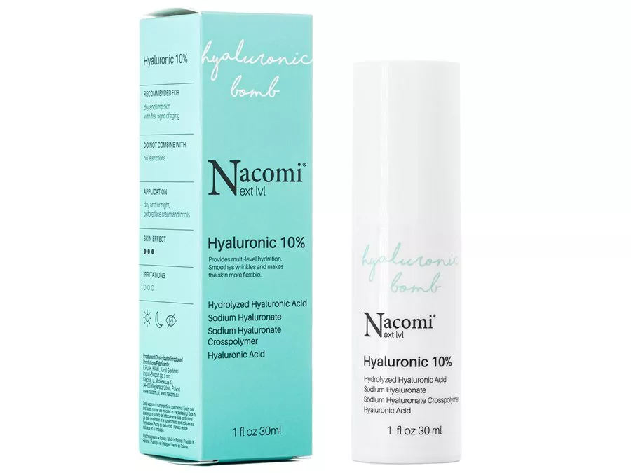 Nacomi - Next Level - Hyaluronic 10% - Serums ar Hialuronskābi 10% - sastāvā ir hialuronskābe četrās formās, kas palīdz uzturēt optimālu ādas mitruma līmeni, un hidrolizēti glikozaminoglikāni, kuri mīkstina, izlīdzina ādu un samazina transepidermālo ūdens zudumu. Savukārt hidrolizētais rauga ekstrakts mitrina, izlīdzina un padara ādu maigāku. Visa formula ir veidota no dabiskas izcelsmes izejvielām.