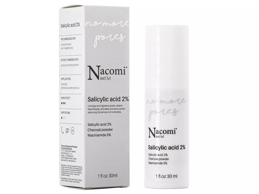 Nacomi - Next Level - Salicylic Acid 2% - Pīlinga Serums ar 2% Salicilskābi - attīroši-nolobošs serums piesārņotai ādai. Satur 2% salicilskābi (BHA), kas labi šķīst taukos, ļaujot skābei iekļūt tauku dziedzeru aizsērējušajās "porās", faktiski tās atbloķējot. Aktivētā ogle attīra un absorbē lieko sebumu, bet pievienotais niacīnamīds samazina pigmentāciju pēc iekaisuma un novērš nepilnību veidošanos. Serums attīra, izlīdzina ādas struktūru un maigi noloba. Visa produkta receptūra tika izveidota no dabīgas izcelsmes izejvielām.