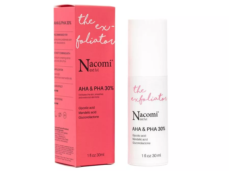 Nacomi - Next Level - Serums ar 30% AHA un PHA Skābju Kompleksu - satur AHA skābes - tostarp glikolskābi, pienskābi, mandeļskābi, citronskābi un vīnskābi -, kas iedarbojas keratolītiski, regulē tauku dziedzeru darbību un izgaismo pigmentāciju. Tāpat satur arī PHA skābes, piemēram, laktobionskābi un glikonolaktonu, kuras maigi eksfoliē ādu un sniedz mitrinošu efektu. Papildu alvejas sula nomierina un mitrina, bet hialuronskābe Sodium Hyaluronate formā palīdz saglabāt ūdeni epidermā, uzturot optimālu mitruma līmeni. Visa formula sastāv no dabiskas izcelsmes izejvielām.