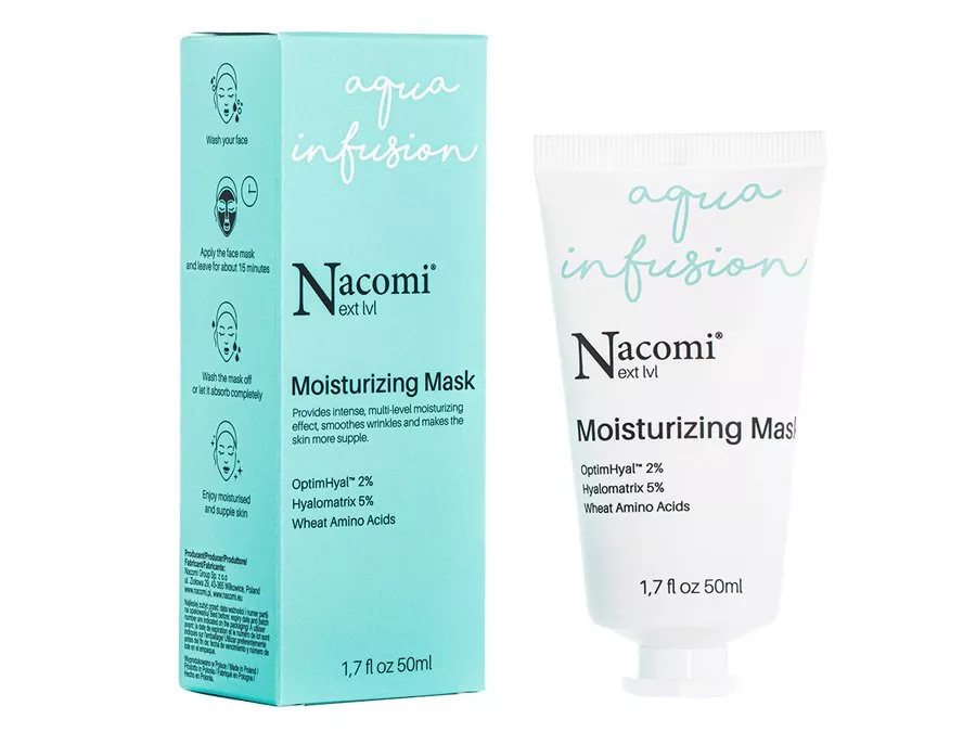 Nacomi - Next Level - Moisturizing Mask - mitrinoša sejas maska, kuras sastāvs ir bagātināts ar 4 formu hialuronskābi, Optim Hyal kompleksu un kviešu aminoskābēm, kas palīdz uzlabot ādas mitruma līmeni. Formulā iekļauts arī pretiekaisuma niacīnamīds un saldo mandeļu eļļa, kas aizsargā ādu no izžūšanas, padara to mīkstāku un elastīgāku. Maska mazina sasprindzinājuma sajūtu un sniedz intensīvu mitrināšanu sausai un dehidrētai ādai. Visa formula izstrādāta, izmantojot dabiski iegūtas izejvielas.