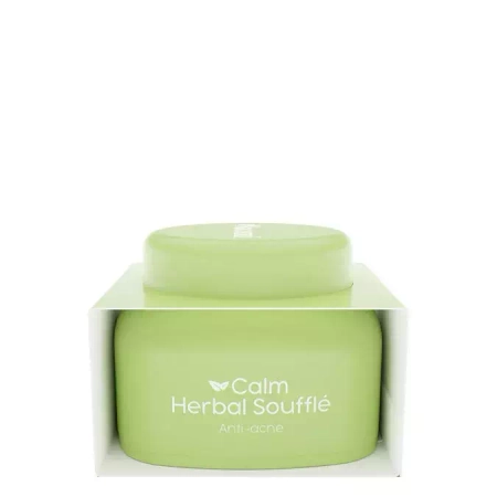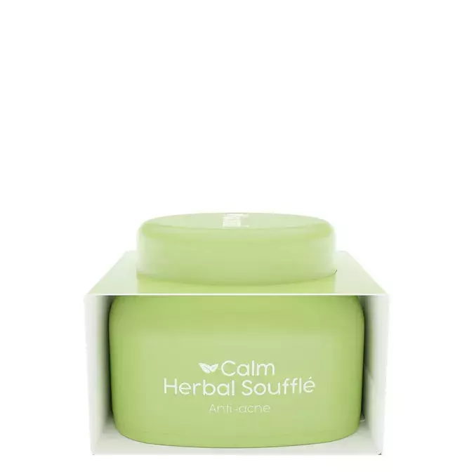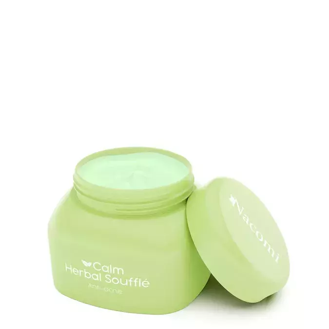 Nacomi - Calm Herbal Sufflé - nomierinošs krēmveida suflē aknes skartai ādai. Tā formula apvieno timiāna ekstraktu ar pretiekaisuma un antibakteriālu iedarbību un kāpostu ekstraktu, kas palīdz mazināt aknes radītos bojājumus. Priežu čiekuru ekstraktam piemīt antibakteriāla iedarbība, savukārt tamanu eļļa ne tikai mazina iekaisumu, bet arī veicina ādas reģenerāciju un aknes izraisīto bojājumu dziedēšanu. Papildus niacīnamīds stiprina ādas aizsargbarjeru, regulē sebuma izdalīšanos, nodrošina antioksidējošu, pretiekaisuma un izgaismojošu efektu, kā arī palīdz samazināt poru redzamību. Visa formula ir veidota no dabiskas izcelsmes izejvielām.
