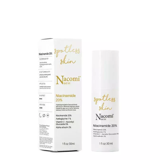 Nacomi - Next Level - Niacinamide 20% - Lokālais Izgaismojošs Serums ar 20% Niacinamīdu - līdzeklis lokālai uzklāšanai pigmentācijas plankumu novēršanai. Pateicoties niacīnamīda, C vitamīna, azeloglicīna un alfa arbutīna saturam, produkts novērš dažādas izcelsmes pigmentāciju, izgaismojot tās un novēršot to atkārtošanos. Serums ir bagātināts ar mitrinošu trehalozi un hialuronskābi, kas veicina ādas reģenerāciju. Līdzeklis izlīdzina ādas toni, samazina grumbas, nomierina iekaisumu un paātrina ādas dzīšanu. Visa formula ir veidota no dabiskas izcelsmes izejvielām.