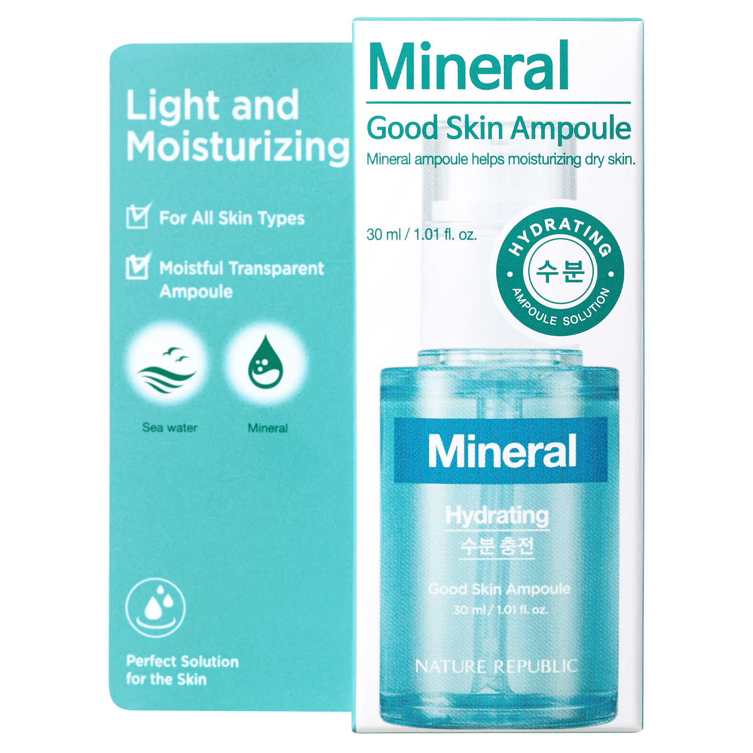 Nature Republic - Good Skin Mineral Ampoule - sejas serums ar mitrinošu iedarbību. Produkta želejas formula ātri iesūcas un ir piemērota jutīgai sejas ādai. Tā sastāvā ir jūras ūdens, kas iegūts no Havaju salām un kopā ar hlorellas ekstraktu un alantoīnu mazina iekaisumu, apsārtumu un kairinājumu. Nātrija hialuronāta un E vitamīna piedevas mitrina ādu, padarot to maigu un gludu.