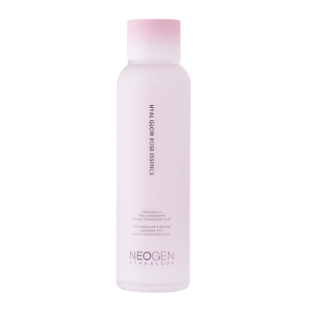 Neogen - Dermalogy Hyal Glow Rose Essence - esence ikdienas sejas kopšanai. Produkta sastāvā esošais hidrolats un damaskas rožu ekstrakts nomierina kairinājumu un iekaisumus. Niacinamīds samazina apsārtumu, kā arī stiprina hidrolipīdu barjeru. Savukārt astoņi hialuronskābes veidi mitrina ādu, aizsargājot to no pārmērīga ūdens zuduma. Damaskas rozes eļļa pastiprina esences nomierinošo iedarbību, bet pantenols un alantoīns veicina ādas reģenerāciju. Līdzeklim ir viegla formula, tāpēc tas ātri uzsūcas un neatstāj lipīgu kārtiņu uz ādas.