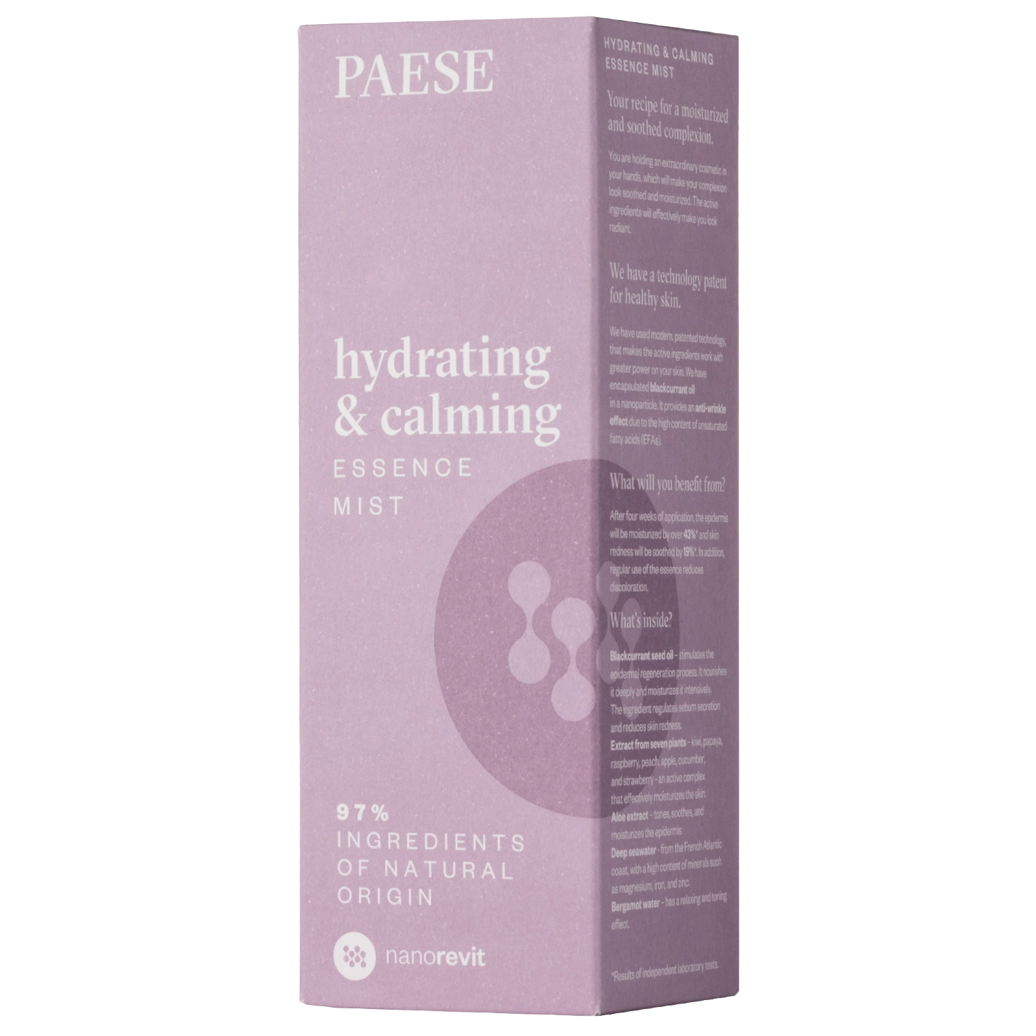 Paese - Nanorevit - Mitrinoša un Nomierinoša Esence Migliņā - esence sejai un ķermenim. Tās sastāvā esošā alveja intensīvi mitrina un palīdz nomierināt kairinātu ādu. Pievienotais jūras ūdens sniedz antiseptisku efektu un mazina iekaisumu, bet upeņu eļļa baro ādu un palīdz regulēt sebuma izdalīšanos. Pateicoties papaijas ekstraktam, esence veicina pigmentācijas samazināšanos un padara ādu gludu un patīkamu pieskārienam. Produkts satur 97% dabiskas izcelsmes sastāvdaļu.