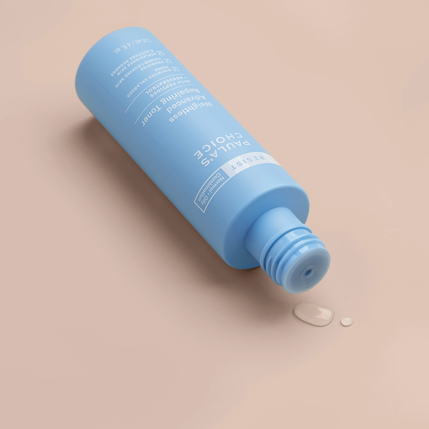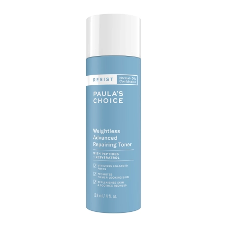 Paula's Choice - Resist Anti - Aging Repairing Toneris - toniks ādai ar pirmajām novecošanās pazīmēm, taukainai un jauktai ādai. Tā sastāvā ir niacinamīds ar seboregulējošu un antioksidantu iedarbību, resveratrols , kas vērsts pret novecošanu, un peptīdi, kas nostiprina un izlīdzina ādu, tādējādi samazinot grumbu rašanos. Produktam ir ļoti viegla, ūdeņaina tekstūra.