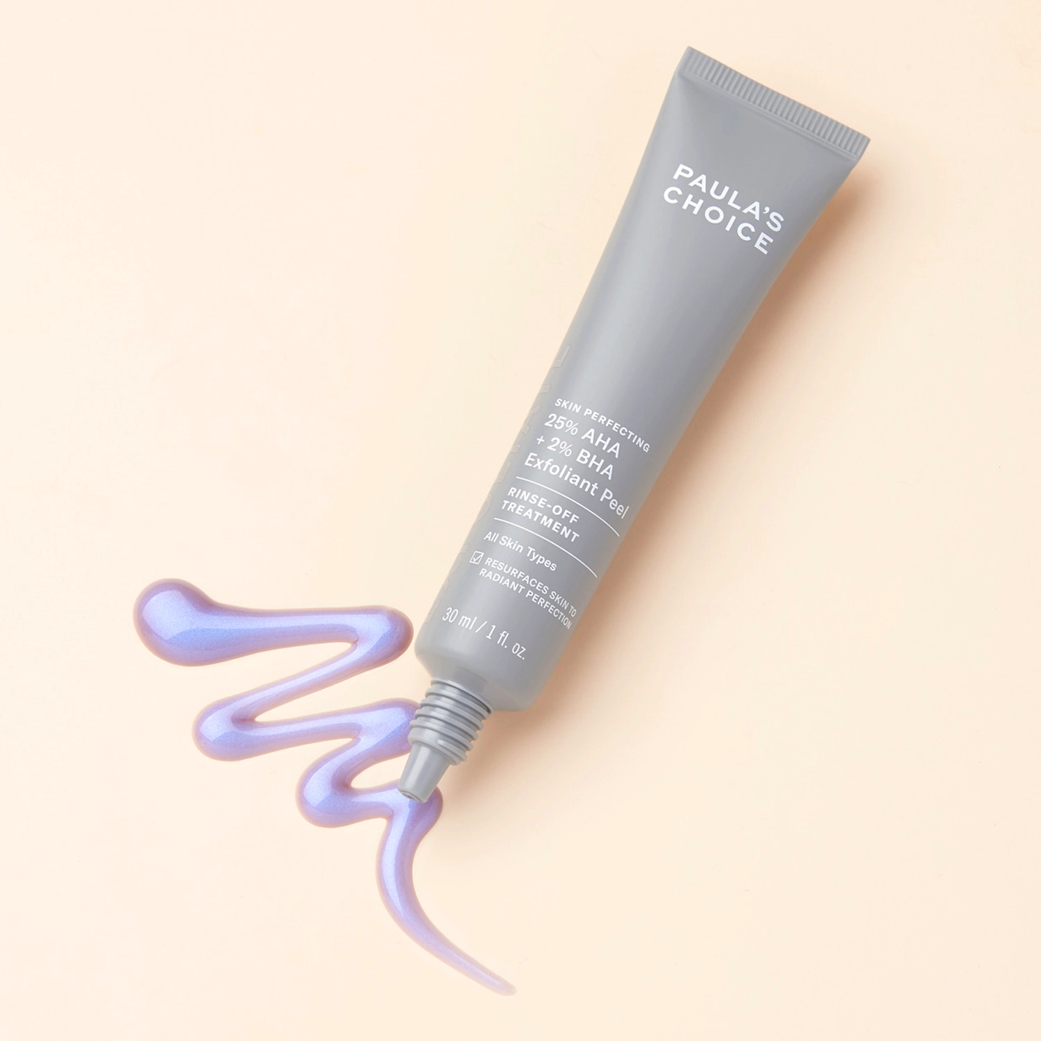 P aula's Choice- Skin Perfecting 25% AHA + 2% BHA Exfoliant Peel - pīlings ar AHA un BHA skābēm, kas efektīvi noloba atmirušās ādas šūnas, izlīdzina ādas toni, izlīdzina sīkās grumbiņas un samazina nepilnības. Pateicoties tauriņziežu ziedu ekstraktam, tas nomierina ādu, savukārt bisabolols remdē iekaisumus un mitrina. Produkts ir piemērots visiem ādas tipiem, un tam ir unikāla ceriņkrāsa.