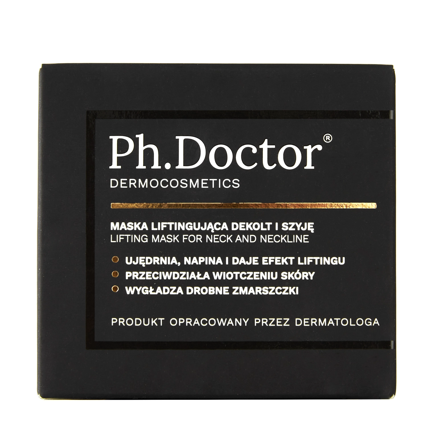 Ph.Doctor - Liftinga Maska Kakla un Dekoltē Zonai - nostiprinoša un liftingojoša maska kaklam, dekoltē zonai un sejas ādai. Produkts piemērots gan sievietēm, gan vīriešiem, kā arī drošs lietošanai grūtniecības un zīdīšanas laikā. Tās formula balstīta uz iekapsulētu (efektivitātes palielināšanai) DMAE - sastāvdaļu ar nostiprinošām, savelkošām un liftinga īpašībām. Maska ir bagātināta arī ar mitrinošu kompleksu, kurā ietilpst Xylitolglucoside, Anhydroxylitol, Xylitol un nātrija hialuronāts. Papildus pantenols nomierina ādu, padara to mīkstu un elastīgu, bet C vitamīns uzlabo ādas toni un piešķir tai veselīgu mirdzumu. Produkts nesatur smaržvielas, ir vegānisks un satur 94% dabiskas izcelsmes sastāvdaļu.