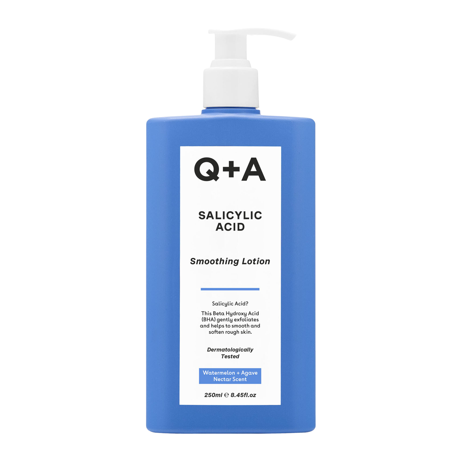Q+A - Salicylic Acid Smoothing Lotion - ķermeņa balzams, kas ir paredzēts visiem ādas tipiem. Tas satur salicilskābi, kas palīdz noņemt melnos punktus, samazina sebuma izdalīšanos un saudzīgi noloba. Auzu milti atbild par mitrināšanu, nomierināšanu un epidermas izlīdzināšanu. Savukārt baltā vītola mizas ekstrakts regulē sebuma izdalīšanos, attīra tauku dziedzerus, kā arī mazina iekaisuma stāvokļus.