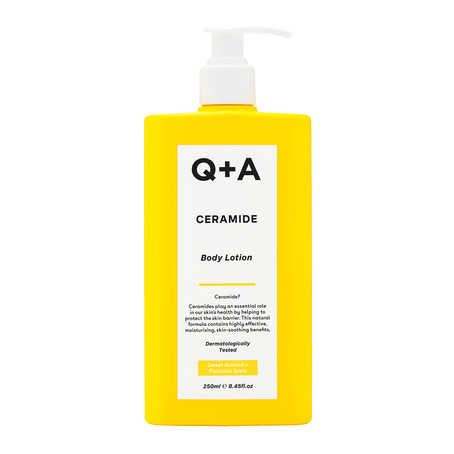 Q+A - Ceramide Body Lotion - keramīdu ķermeņa balzams ar vieglu konsistenci. Tas ātri iesūcas, atstājot maiguma un gluduma sajūtu. Tam piemīt krēmveida želejveida formula, kas nodrošina intensīvu mitrināšanu. Saldais grauzdēto mandeļu un pistāciju aromāts padara produkta lietošanu patīkamāku. Līdzeklis lieliski atjauno ādu un novērš tās sausumu. Tā sastāvā ir keramīdi, kas stiprina hidrolipīdu barjeru, kā arī skvalāns no olīvām, kas uzlabo mitrināšanas līmeni. Jojobas eļļas pievienošana izlīdzina un mīkstina epidermu, savukārt cukura komplekss stimulē dabīgo mitrinošo faktoru veidošanos. Produkts satur 96,5% dabīgu sastāvdaļu un ir vegāns.