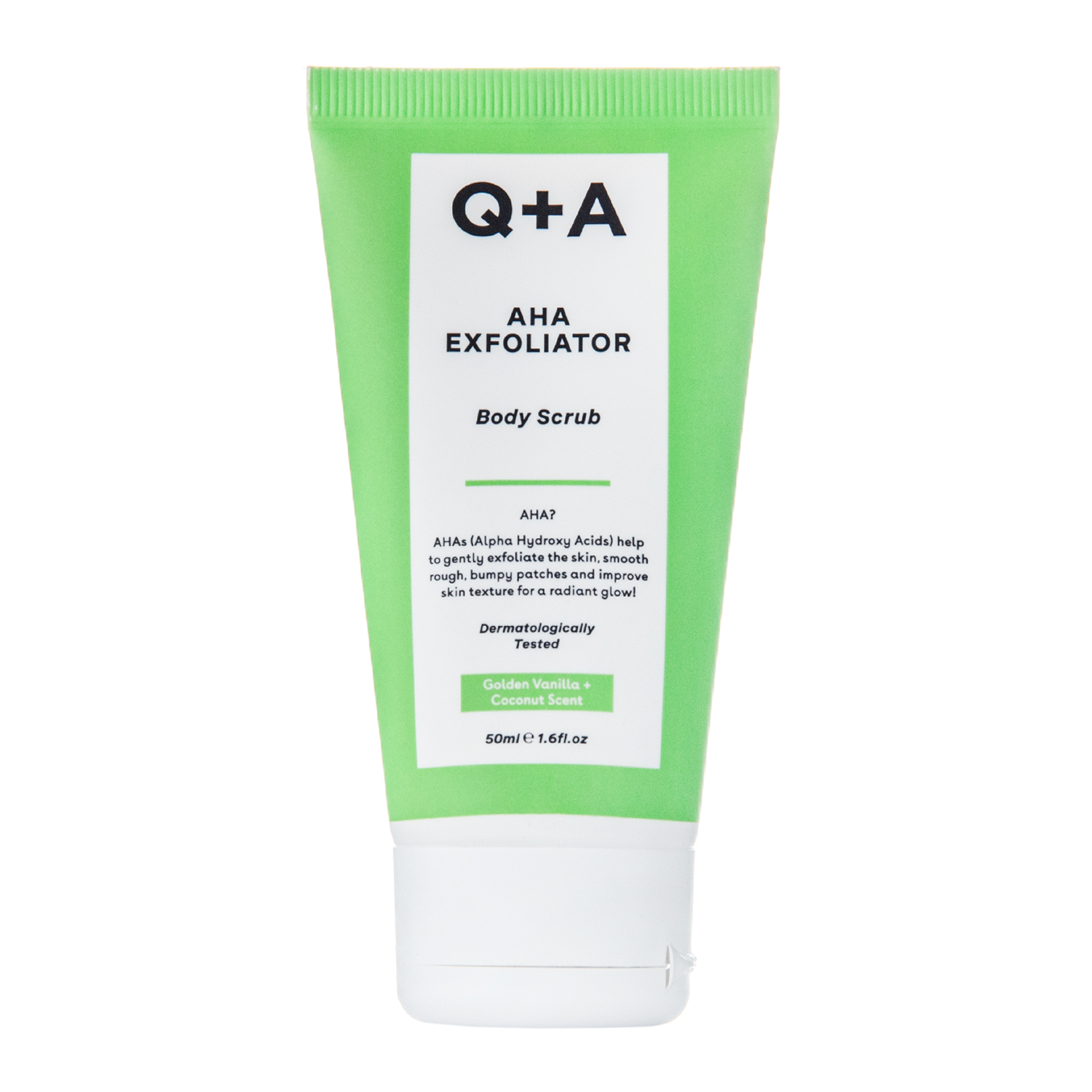 Q+A - AHA Exfoliator Body Scrub - izlīdzinošs ķermeņa skubis ar eksfoliējošām daļiņām un AHA skābēm. Produktam peimīt neatkārtojams eksotiskā kokosrieksta un zeltainās vaniļas aromāts. Tā sastāvā ir pienskābe un glikolskābe, kas maigi noloba atmirušo epidermu, padarot ādu maigu un gludu. Tas tika bagātināts ar barojošām eļļām, tostarp jojobas eļļu, kas mitrina un atjauno ādu. Smiltsērkšķu un vīnogu kauliņu eļļas ir antioksidantu avots un uzlabo ādas tvirtumu. Produktam ir patīkama, krēmveida konsistence. Tas satur 95,7% dabīgu sastāvdaļu un ir vegāns.