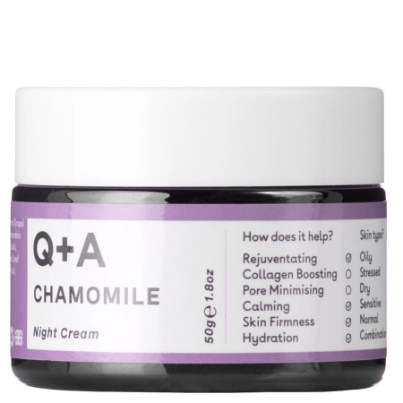 Q+A - Chamomile - Night Cream - barojošs nakts krēms, kas savu nomierinošo īpašību dēļ ir paredzēts nogurušai ādai, kas pakļauta antioksidatīvam stresam. Par savu atjaunojošo iedarbību tas pateicas saulespuķu, vīnogu kauliņu un jojobas eļļām, kas padara ādu maigāku un elastīgāku. Šī sviests nodrošina barošanu un veido okluzīvo slāni, kas aizsargā ādu no ārējo faktoru iedarbības. Galveno sastāva elementu veido kumelīšu ekstrakts, kas nomierina ādas kairinājumus un apsārtumu, kā arī mazina iekaisumus.