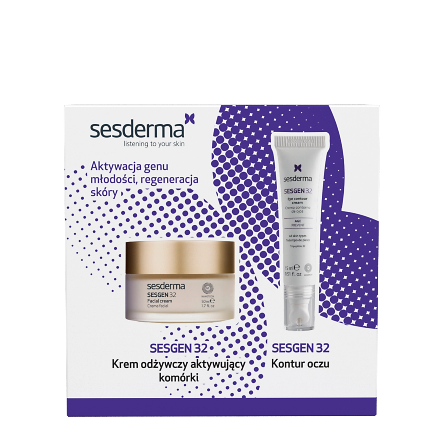 - SESGEN 32 Eye Contour - pretnovecošanās krēms maigai ādai ap acīm. Pateicoties peptīdam un adenozīnam, produkts efektīvi samazina sīkās grumbiņas, uzlabo ādas tvirtumu un elastību, kā arī izlīdzina tās toni. Turklāt barojošie šī sviests, nātrija hialuronāts un pienskābe nodrošina optimālu mitruma līmeni un komforta sajūtu, padarot ādu gludu un starojošu. Tilpums: 15 ml.