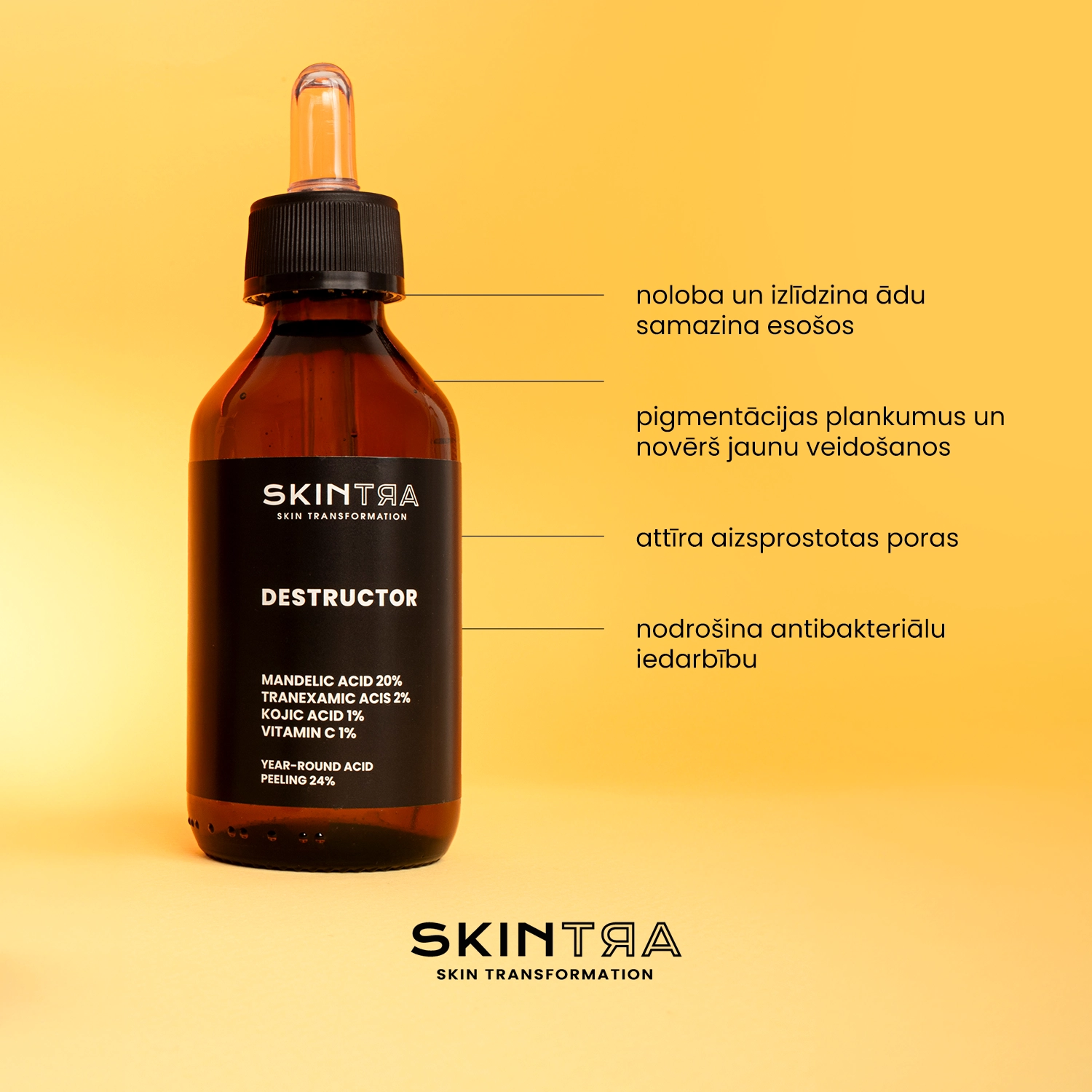 SkinTra - Destructor - skābju pīlings sejas kopšanai mājas apstākļos, piemērots lietošanai visa gada garumā. Tā sastāvā ietilpst mandeļskābe, kojskābe, traneksamīnskābe, azeloglicīns un C vitamīns. Augstā skābju koncentrācija (24%) intensīvi eksfoliē, izlīdzina un izgaismo ādu, kā arī, pateicoties tirozināzes aktivitāti kavējošām īpašībām, samazina jaunu pigmentācijas plankumu veidošanās risku. Ja Tava āda ir nevienmērīga, pelēcīga, ar komedoniem vai pūtītēm – šis ir Tavs MUST HAVE produkts! Jau pēc pirmās lietošanas reizes tas sniedz redzamus rezultātus kā pēc kosmetologa vizītes, tikai mājas apstākļos. Pīlingam nav fototoksiska vai fotoalerģiska potenciāla, tā pH ir 2,7. Produkts ir vegānisks. Turklāt skābju pīlings „Destructor” pasākumā Kosmētikas tirgus pērle 2022 ieguva balvu kategorijā „Ādas kopšana”.