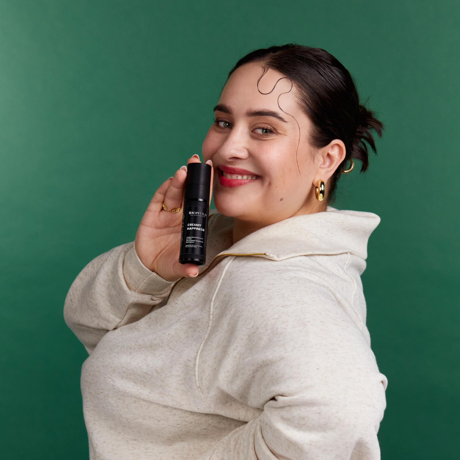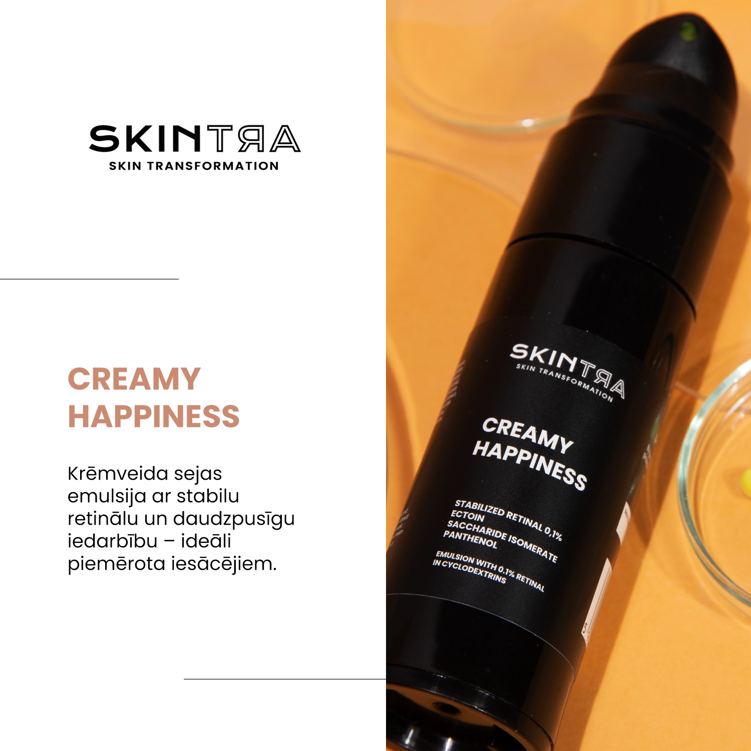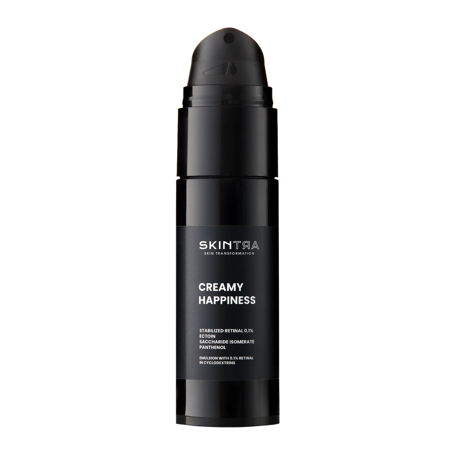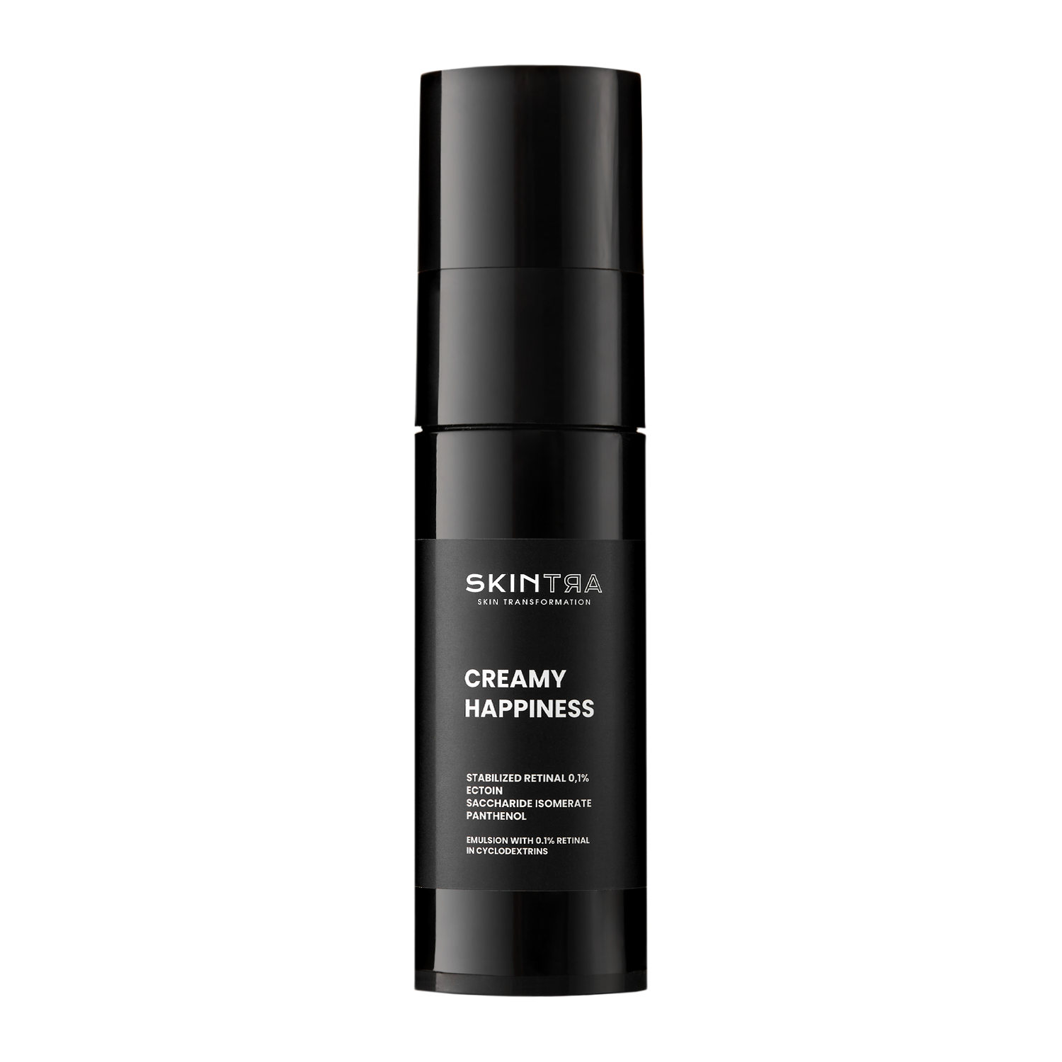 SkinTra - Creamy Happiness - daudzfunkcionāla sejas emulsija ar ciklodekstrīnos ietvertu 0,1% retinālu. Tā ir piemērota ādai ar grumbām, tvirtuma zudumu, nepilnībām, paplašinātām porām vai hiperpigmentāciju. Izmantotā vielas iekļaušanas tehnoloģija kompleksveidīgajā ciklodekstrīnā nodrošina labāku produkta stabilitāti un efektivitāti. Papildus tam retināls tiek atbrīvots lēni, tāpēc tas iedarbojas uz ādu pakāpeniski un ar mazāku kairinājumu izraisīšanas risku. Emulsijai piemīt krēmveida konsistence, kas nodrošina viegli aptverošu sajūtu, vienlaikus labi uzsūcoties. Tā ir bagātināta ar nomierinošām un mitrinošām sastāvdaļām, kas mazina iespējamo sausumu un kairinājumu panesamības pret retinālu veidošanās laikā. Tās sastāvā atrodas nomierinošs ektoīns, atjaunojošs pantenols, kā arī saharīdu izomerāts, kas lieliski mitrina un stiprina hidrolipīdu barjeru. Produkts tika noslēgts ērtā bezgaisa iepakojumā, kas ierobežo gaismas un gaisa piekļuvi, vēl vairāk uzlabojot formulas stabilitāti. Emulsija var tikt lietota visiem ādas tipiem, tostarp jutīgai ādai. Kosmētiku uzglabā vēsā, ēnainā vietā, vēlams ledusskapī.