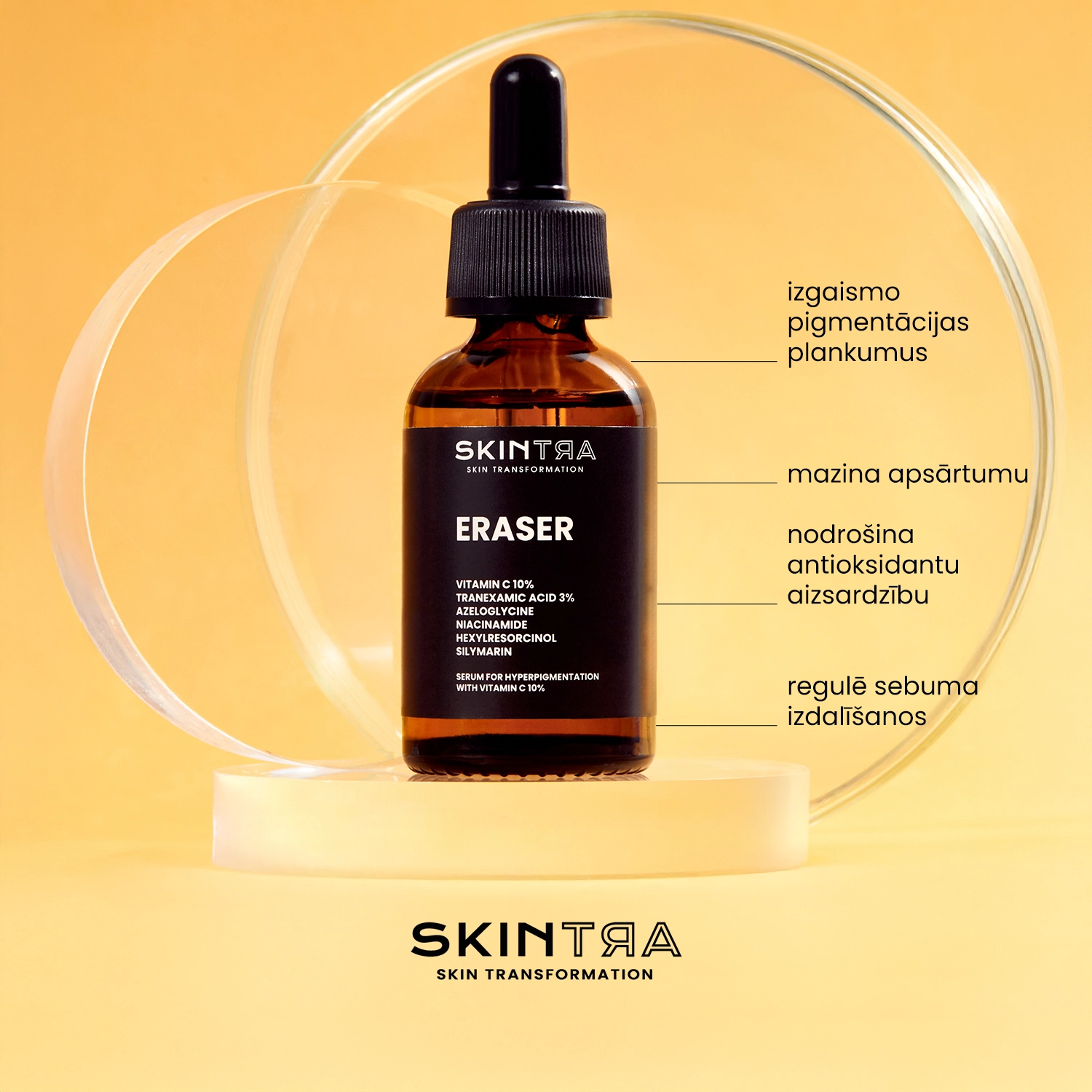 SkinTra - Eraser – komplekss ādas kopšanas serums, kas cīnās ar dažāda veida krāsas izmaiņām – kā sarkanām (pēc aknes, pēc iekaisuma), tā arī brūnām (melanīna pārpalikuma rezultātā). Tam ir ūdeņaina konsistence, kas atstāj nedaudz pamanāmu slāni uz ādas. Seruma pH vērtība ir apm. 5. Recepte sastāv no efektīvām aktīvām sastāvdaļām, kas iedarbojas uz dažādiem krāsas maiņas mehānismiem. Serums satur 10% etilētu C vitamīnu, kas nodrošina antioksidējošu iedarbību un padara ādu gaišāku, ietekmējot melanīna sintēzi, kavējot tirozināzes aktivitāti. Sinerģijā ar C vitamīnu darbojas 3% traneksamskābe, kas, pateicoties tā pretiekaisuma īpašībām, palīdz samazināt apsārtumu, kā arī brūnas krāsas maiņu. Niacinamīds arī atbalsta ādas izgaismošanu, rūpējoties par tās mitrināšanu un atjaunošanu. Papildus iedarbību stiprina heksilresorcinols, kas samazina sarkanās un brūnās krāsas maiņu redzamību. Formulā netrūkst arī azeloglicīns, kas regulē ādas lobīšanās procesu, kā arī silimarīns, kam piemīt spēcīgas antioksidanta īpašības. Produktu ieteicams lietot katru dienu un regulāri kopā ar aizsarglīdzekļiem pret sauli, lai rezultāti būtu redzami jau pēc dažām nedēļām. Tā formula ir vegāna, kā arī nav paredzēta lietošanai grūtniecēm.