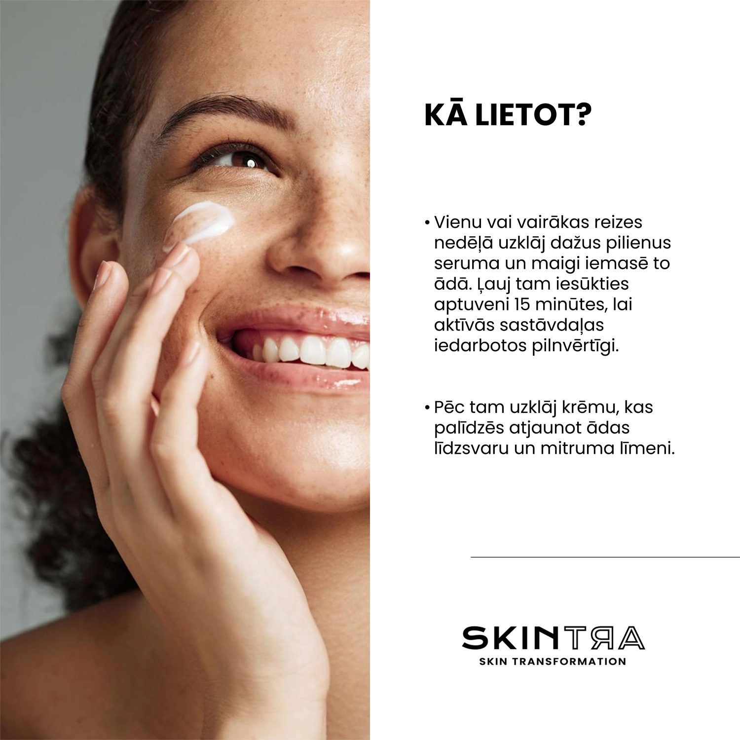 - SkinTra - Mr. Smoother - Uz tīras un nosusinātas ādas uzklāj dažus pilienus seruma un maigi izklāj to pa ādu. Lieto vakarā. Pēc skābes lietošanas ieteicams pagaidīt 10-15 minūtes un tad uzklāt mitrinošu krēmu. Lietošanas biežumu pielāgo savām ādas vajadzībām un tipam.