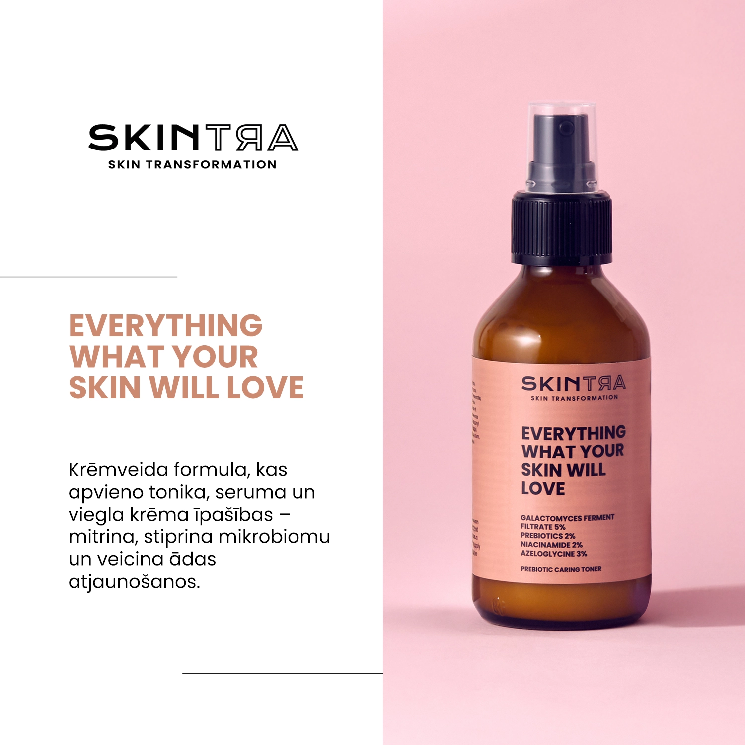 SkinTra - Everything What Your Skin Will Love - krēmveida toniks, kura uzdevums ir ne tikai mūsu ādas fizioloģiskā pH līmeņa atjaunošana. Ta daudzfunkcionālā pielietojuma pamatā ir daudzfunkcionālas sastāvdaļas. Pateicoties īpaši vieglai emulsijas formulai, to var lietot kā krēmu, kura mitrinošās, izlīdzinošās un mīkstinošās īpašības ir panāktas galvenokārt ar hidrofīlo (ūdeni mīlošo) komponentu palīdzību. Tādi emolienti kā skvalāns un Izoamila laurāts tika izvēlēti tādā veidā, lai pēc iespējas lielākā mērā minimalizēt komedogēno potenciālu un pat to samazināt, turpinot rūpējoties par ādas lipīdu apvalku. Pateicoties sastāvā esošajām prebiotikām, tiek aizsargāts arī mikrobioms, kas ievērojami paātrina atjaunošanu, nomierina ekzēmu un mazina bakteriālās pūtītes. Augstā sastāvdaļu koncentrācija paplašināja kopšanas apmēru, ietverot pigmentācijas plankumu novēršanu un izgaismošanu (neradot pīlingu), aizsardzību pret brīvajiem radikāļiem jeb novecošanās procesu palēnināšanu un iekaisuma stāvokļu nomierināšanu. Šī iemesla dēļ līdzeklim piemīt arī seruma forma, ar kura palīdzību varat bagātināt sava krēma iedarbību. Pielāgojiet lietošanas veidu atbilstoši ādas tipam. Produkts var tikt izmantots arī kā ķermeņa balzams. Šajā lomā tas būs ideāli piemērots tiem, kas dod priekšroku vieglām konsistencēm, kas ātri uzsūcas. Līdzekļa daudzpusīgums ļauj ietaupīt vietu kosmētikas somiņā, piemēram, ceļojojuma laikā. Produkta pH sasniedz aptuveni 5,5.
