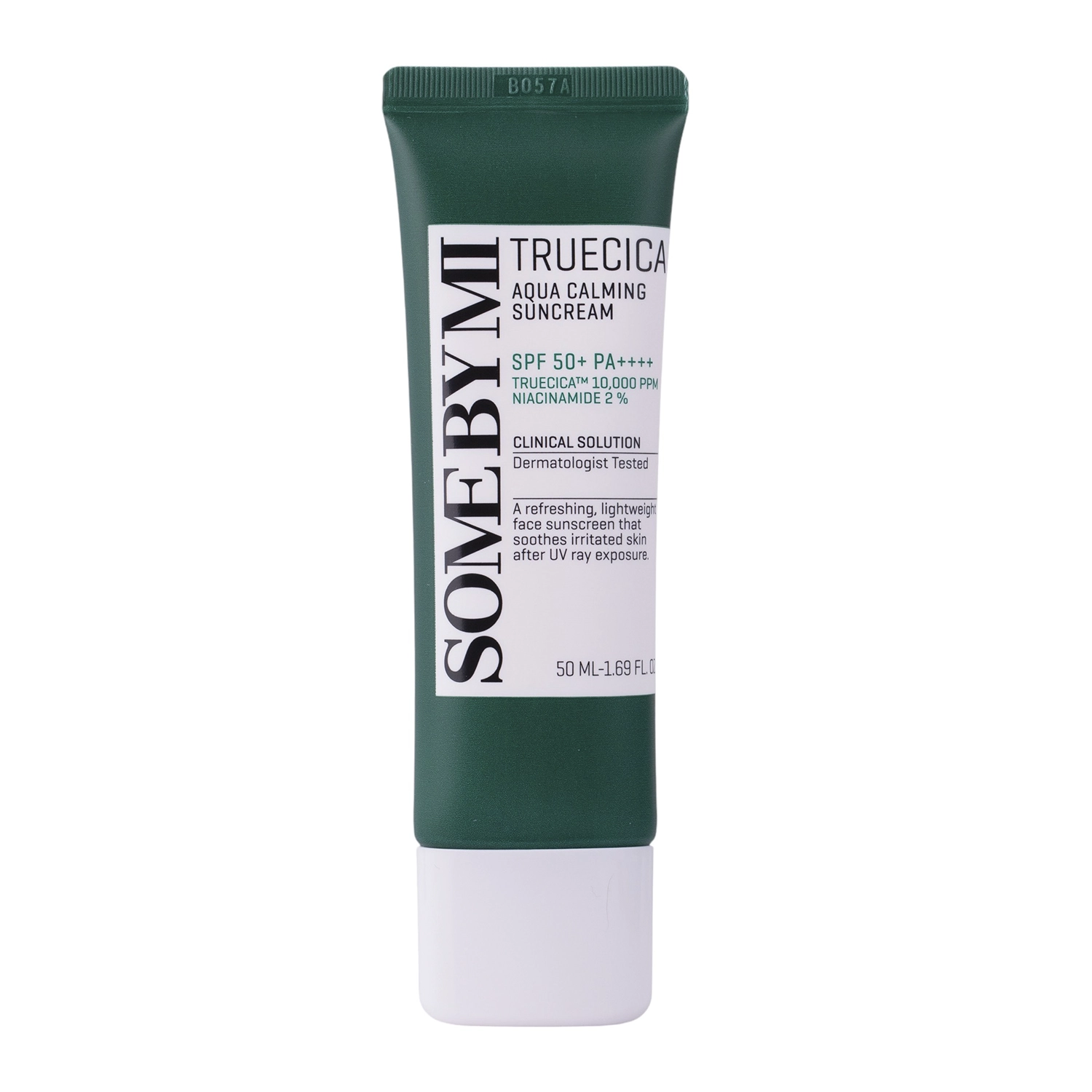 Some ByMi - Truecica Aqua Calming Suncream SPF50+/PA++++ - saules aizsargkrēms, kas nomierina ādu, pateicoties asiatiskās centellas (Centella Asiatica) ekstraktam, kam piemīt nomierinoša iedarbība un kas stimulē reģenerācijas procesus. Ķīmiskie filtri nodrošina augstu aizsardzību pret UVA un UVB starojumu, savukārt adenozīns aizkavē novecošanās procesus, kā arī iedarbojas pret grumbu veidošanos un izgaismo. Niacinamīda pievienojums stiprina ādas barjeru, tam piemīt seboregulējoša, antioksidanta un pretiekaisuma iedarbība. Savukārt hialuronskābe saista ūdeni epidermā, lai uzturētu optimālu mitruma līmeni, savukārt pantenolam ir dziedinoša, nomierinoša un elastīga iedarbība.