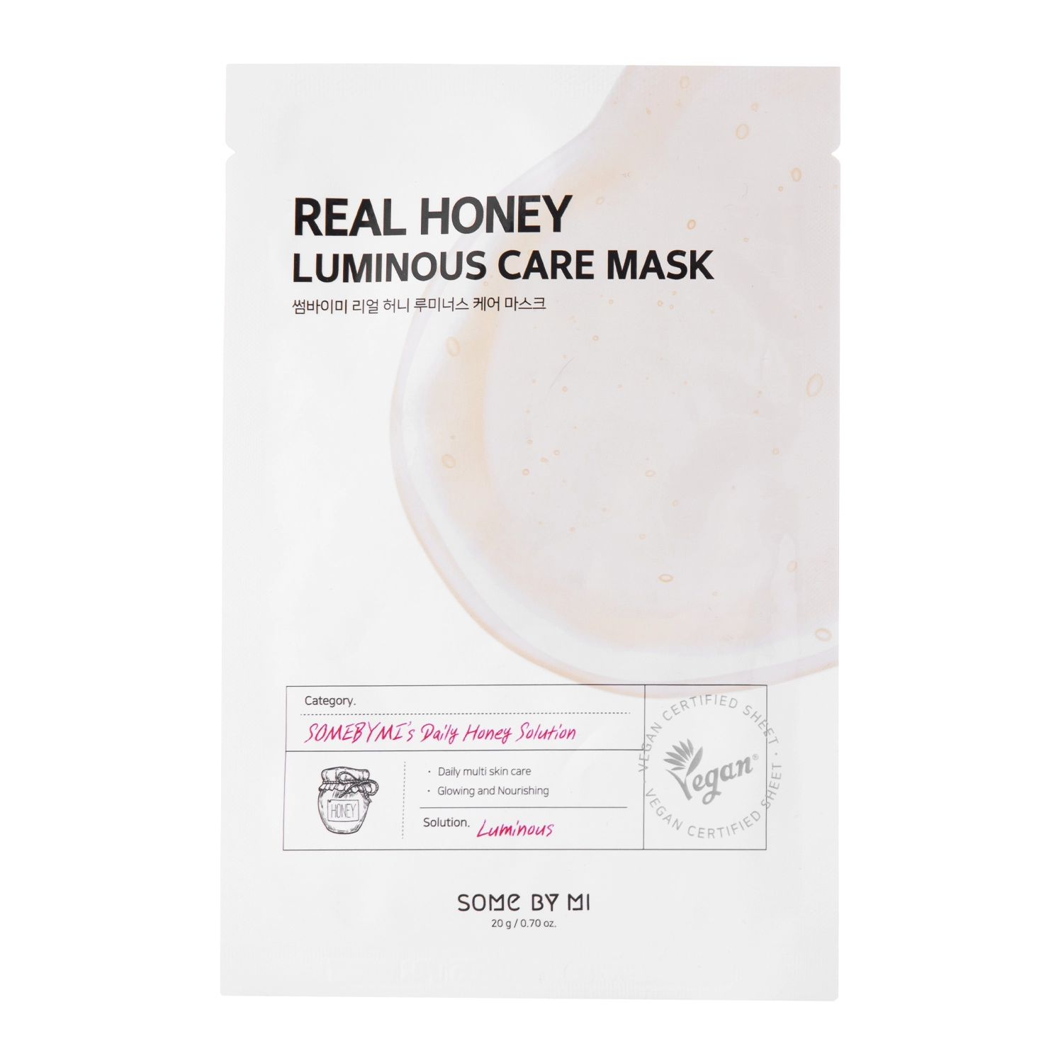Some By Mi - Real Honey Luminous Care Mask - sejas auduma maska ar betaīnu un nātrija hialuronātu, kas efektīvi mitrina sejas ādu. Tā satur arī pantenolu, kas nomierina kairinājumu un apsārtumu, un reģenerējošu medus ekstraktu. Pēc maskas uzklāšanas āda kļūst mitrināta, starojoša un mirdzoša. Produkts ir piemērots vegāniem.