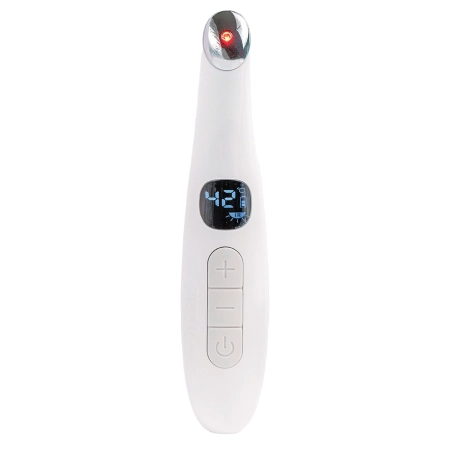 Lietošanas veids: Zem acīm uzklāj nelielu krēma vai seruma daudzumu (zirnīša lielumā) un maigi iemasē to tīrā ādā ap acīm ar pirkstu. Uzklāšanas laikā uzmanies, lai produkts nenokļūtu acīs. Ierīci nedrīkst lietot bez iepriekš uzklāta kosmētiskā līdzekļa. Pēc tam nospied un turi barošanas pogu, lai ieslēgtu masāžieri. Procedūras laikā neskaties tieši LED gaismās. Temperatūru vari pielāgot ar pogām “+” un “-”. Ar īsu barošanas pogas spiedienu vari pārslēgties starp 1., 2. un 3. režīmu. Apakšējā plakstiņa masāžai novieto masāžiera uzgali iekšējā acs kaktiņā, tieši zem apakšējām skropstām, un maigi virzi to uz ārējo acs kaktiņu. Kustībai jāilgst aptuveni 15 sekundes, lai āda pakāpeniski uzsiltu. To vari atkārtot 1-2 reizes, taču vienu un to pašu zonu nemasē ilgāk par 60 sekundēm. Augšējam plakstiņam ieteicams izmantot tikai 3. režīmu, kurā sarkanā LED diode ir izslēgta. To pašu atkārto ar otru aci. Noslēgumā nospied un turi barošanas pogu, lai izslēgtu ierīci, un noslauki metāla masāžas galviņu ar tīru, sausu drāniņu.