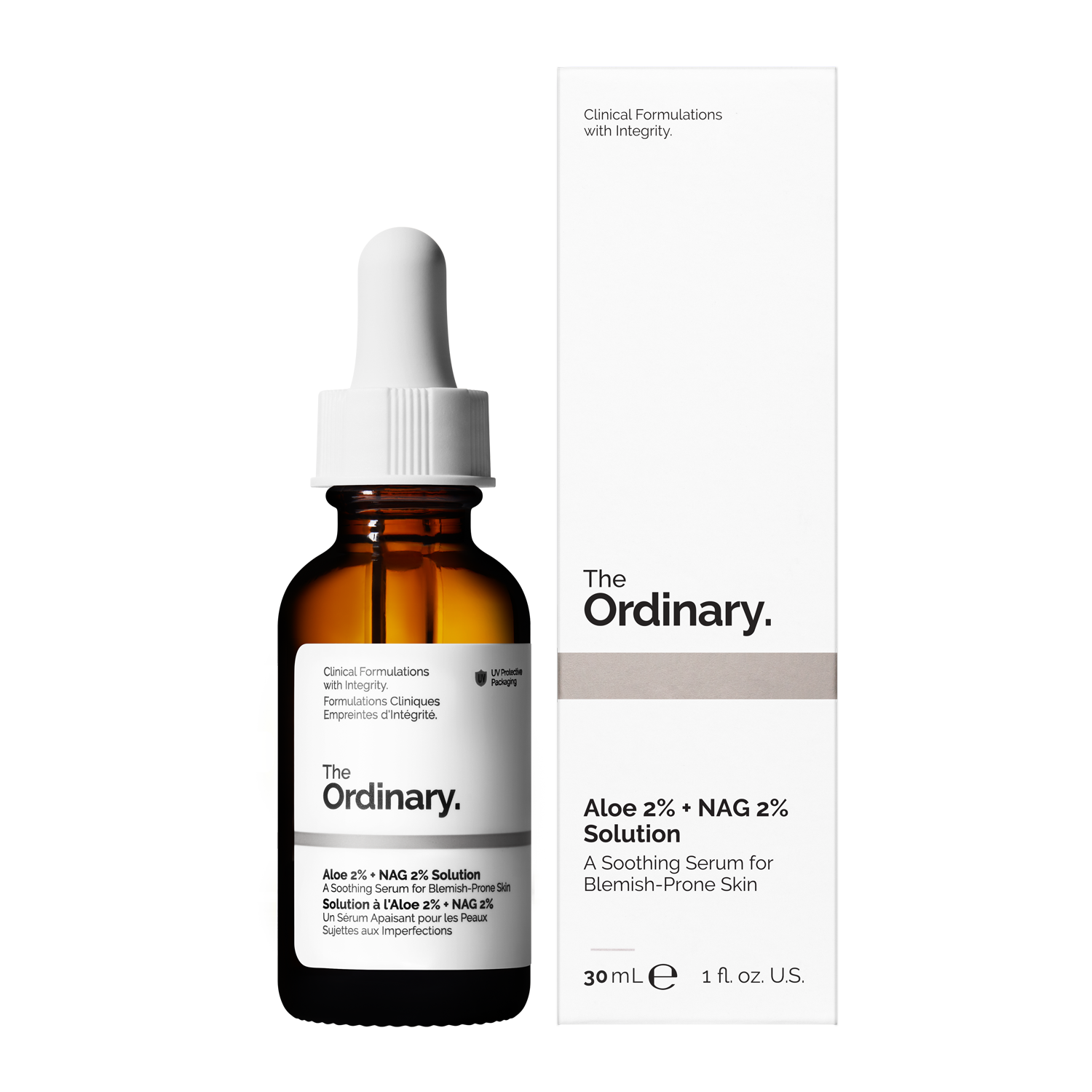 TheOrdinary - Aloe 2% + NAG 2% šķīdums - viegls, nomierinošs serums, kas izstrādāts, lai apmierinātu ādas ar noslieci uz plankumiem vajadzības. Samazina pēpneoloģisko plankumu izskatu ar pretpūtītes sastāvdaļām, kas viendabīgi izlīdzina sejas toni un uzlabo ādas tekstūru, vienlaikus palīdzot sašaurināt poras un stiprināt ādas barjeru. Sastāvā ir iekļauta pulverveida alvejas mīkstums mitrināšanai. Sastāvs satur arī N-acetilglikozamīnu (NAG), biotehnoloģiski iegūtu sastāvdaļu, kuras iedarbība pierādīta cīņā pret ādas toņa nepilnībām. To papildina palmitētā pentapeptīda-4 peptīdu tehnoloģija, kas izlīdzina ādas struktūru, vienlaikus nodrošinot efektīvu aizsargbarjeru. Tās pH ir no 5,0 līdz 6,0.