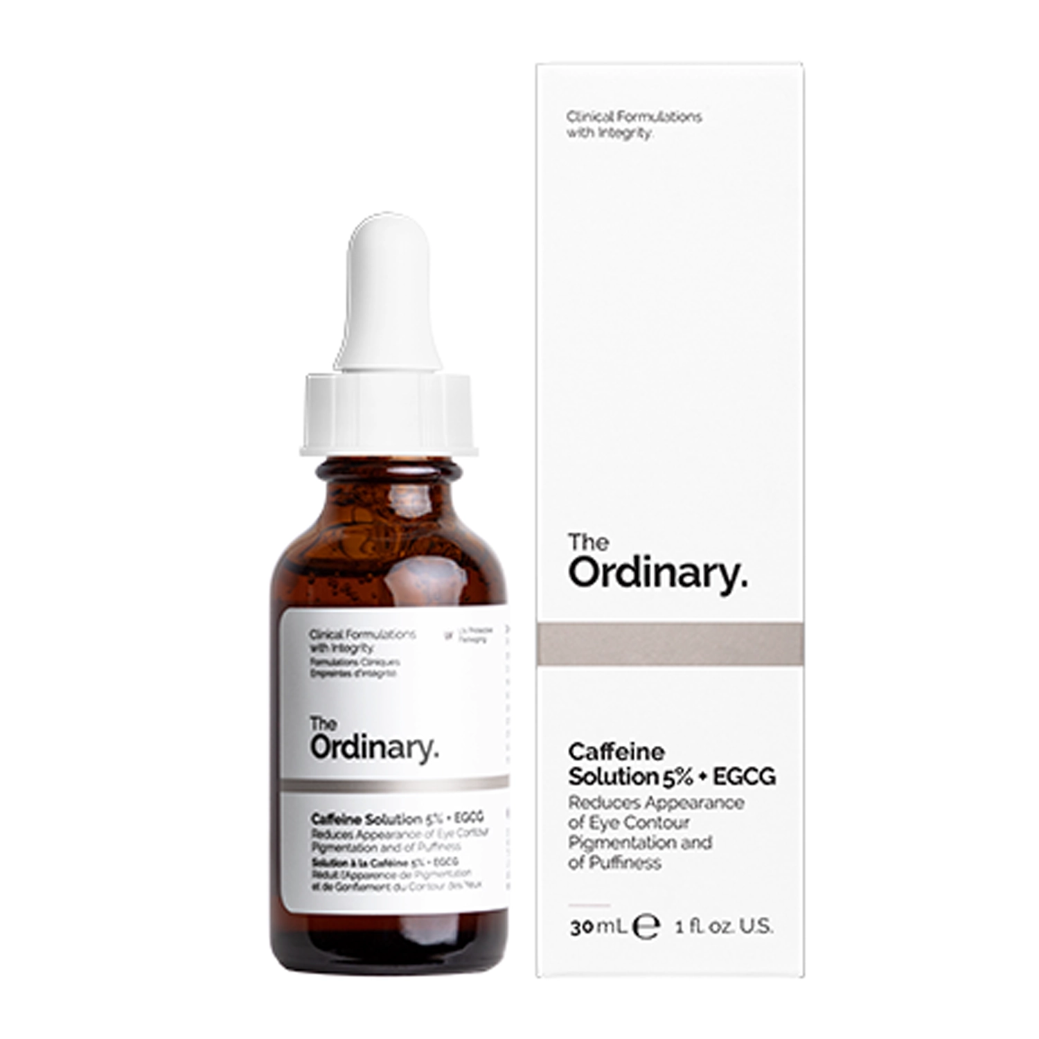 The Ordinary- Kofeīna šķīdums 5% + EGCG - serums uz ūdens bāzes, kas mazina pietūkumu un tumšos lokus zem acīm . Satur augstu kofeīna koncentrāciju, kas stimulē mikrocirkulāciju ādā un sašaurina asinsvadus, tādējādi palīdzot mazināt pietūkumu un izgaismot tumšos lokus, un EGCG jeb epigalokatehīna galātu, kas tiek iegūts no zaļās tējas lapām un kam piemīt spēcīgs antioksidants (daudz spēcīgāks nekā vitamīnam C), stiprinošs un pretnovecošanās efekts. Seruma pH svārstās no 4,5 līdz 5,0.