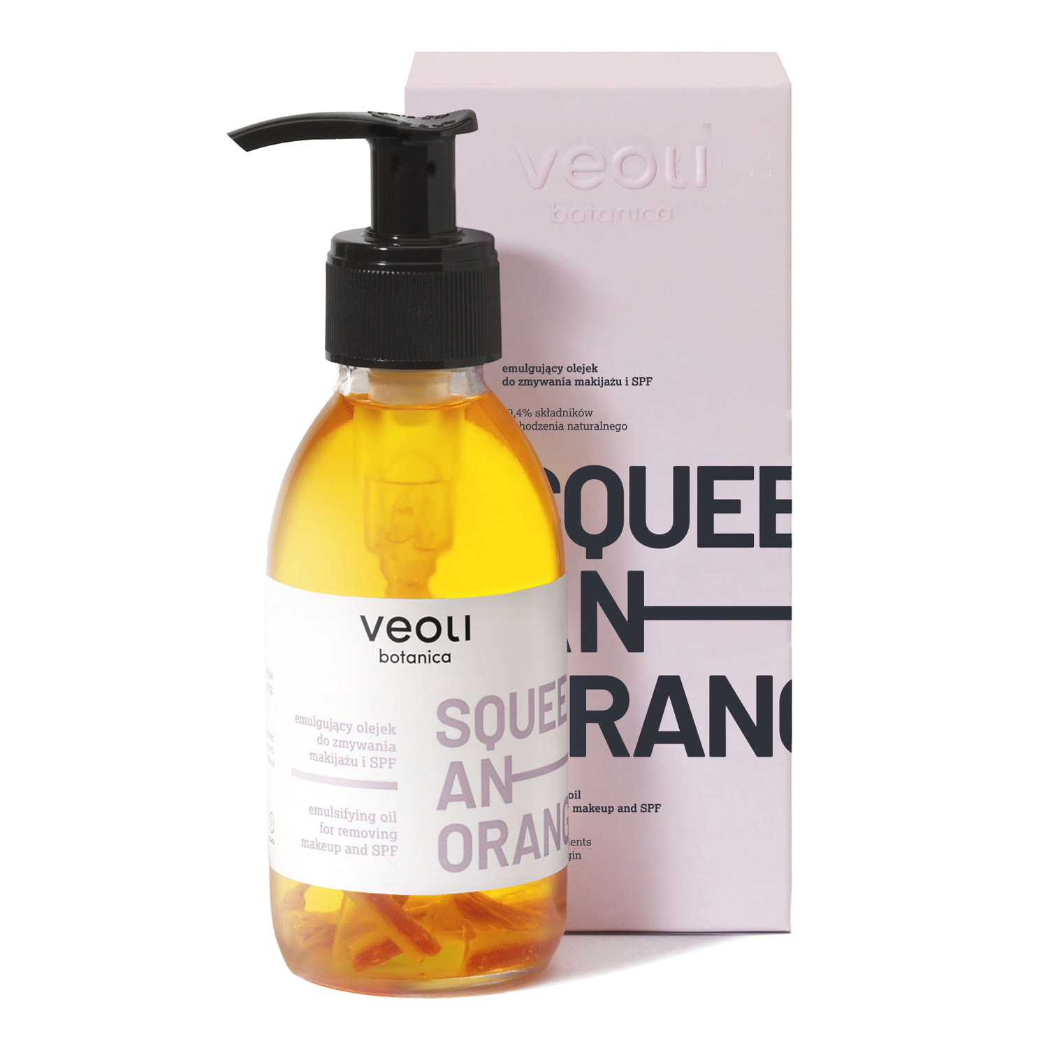 Veoli Botanica - Squeeze an Orange - Emulģējoša Eļļa Grima un SPF Noņemšanai - eļļa pirmajam ādas attīrīšanas posmam. Tā efektīvi attīra ādu no dekoratīvās kosmētikas, netīrumiem, sebuma un SPF krēmu atlikumiem. Produktam ir enerģizējošs apelsīna aromāts, un eļļā redzami iekausēti apelsīna gabaliņi. Sastāvu bagātina vērtīgas eļļas, tostarp jojobas, smiltsērkšķu un argāna eļļas, kas atbalsta ādas atjaunošanos, uzlabo tās elastību un baro. Vīnogu kauliņu eļļa palīdz cīņā ar akni, tāpēc ir lieliski piemērota taukainas un kombinētas ādas kopšanai, savukārt sezama eļļa nodrošina aizsardzību un pretnovecošanās iedarbību. Šīs eļļas stiprina ādas lipīdu barjeru, padarot ādu gludu un mitrinātu, bet formulā iekļautais emulgators nodrošina vieglu eļļas noskalošanu ar ūdeni. Produkts satur 99,4% dabīgas izcelsmes sastāvdaļu, ir vegānisks un atbilst less waste principiem.