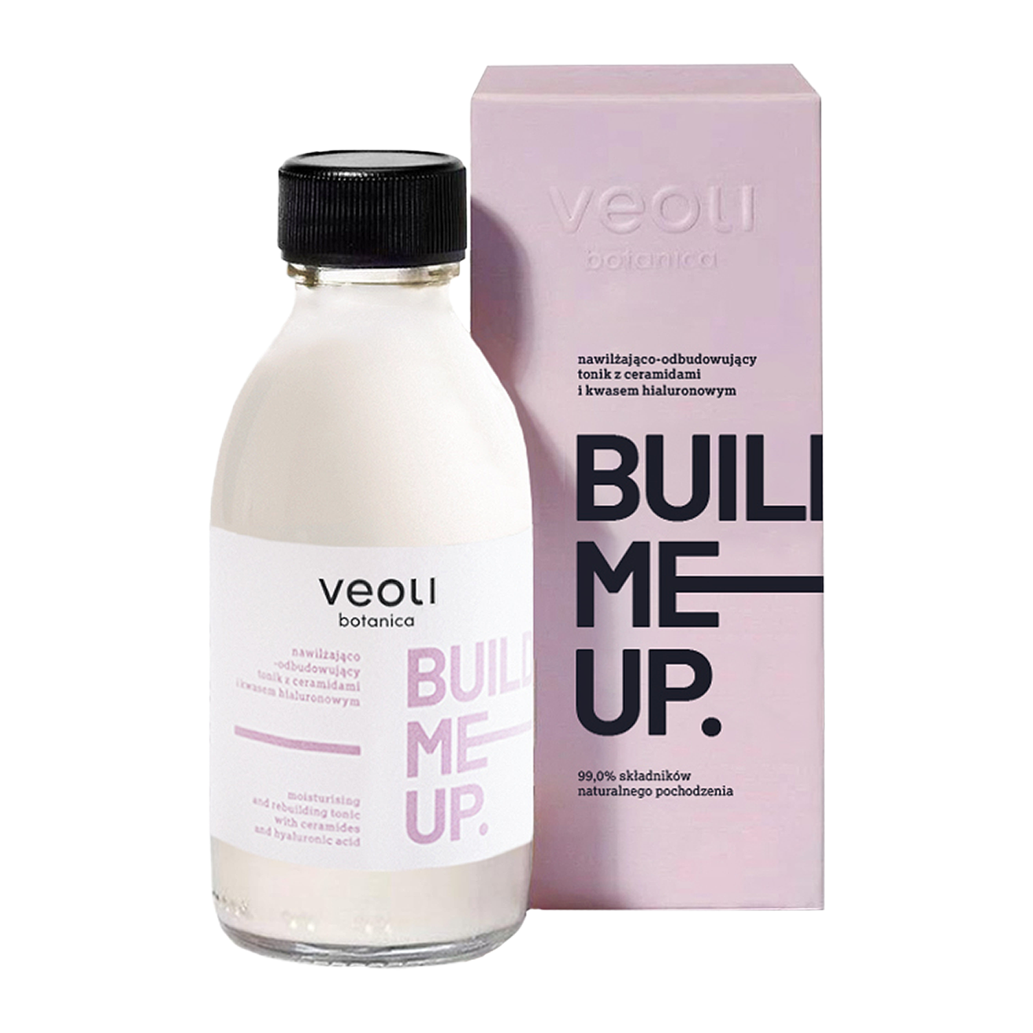 Veoli Botanica - Build Me Up - Mitrinošs un Atjaunojošs Toniks ar Keramīdiem un Hialuronskābi - barojošs sejas toniks ar bagātīgu formulu, kas lieliski sagatavo ādu nākamajiem kopšanas soļiem. Tas palīdz līdzsvarot ādas pH līmeni un nodrošina nepieciešamo mitrināšanu, atstājot ādu nomierinātu un atslabinātu. Formulā ir iekļauta trīs dabiskas izcelsmes keramīdu kombinācija, kas stiprina ādas hidrolipīdu barjeru. Hialuronskābe un skvalāns palīdz uzturēt optimālu mitruma līmeni, Āzijas centellas ekstrakts nomierina kairinājumu, bet zaļās tējas hidrolāts darbojas kā spēcīgs antioksidants. Toniks ir piemērots ikdienas lietošanai visiem ādas tipiem, īpaši sausai, jutīgai vai bojātai ādai ar traucētu hidrolipīdu barjeru. Tas satur 99% dabiskas izcelsmes sastāvdaļu un ir iepakots pārstrādājamā stikla pudelē. Produkts ir vegānisks.