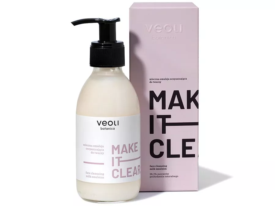 Veoli Botanica - Make It Clear - maiga attīrošā emulsija, kas balstīta uz dabīgām sastāvdaļām. Satur maigas attīrošās vielas, kā arī saulespuķu un vīnogu kauliņu eļļas, kas efektīvi noņem netīrumus un vienlaikus aizsargā ādas dabisko hidrolipīdu slāni. Pateicoties alantoīna, pantenola un melno jāņogu pumpuru ekstrakta klātbūtnei, emulsija nomierina ādu, neatstāj savilkuma sajūtu un palīdz uzturēt tās veselīgu stāvokli. Ieteicama visiem ādas tipiem, īpaši sausai, jutīgai un kairinātai ādai. Produkts satur 98,3% dabiskas izcelsmes sastāvdaļu, ir piemērots vegāniem un atbilst less waste principiem.