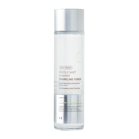 VT Cosmetics - Reedle Shot Synergy Sparkling Toner - sejas toniks, kas atsvaidzina un mitrina ādu. Sastāvā ir CICA komplekss, kas sastāv no Centella Asiatica un tās izolātiem, kuriem piemīt pretiekaisuma, mitrinošas un kairinājumu nomierinošas īpašības. Hialuronskābes un arginīna pievienojums pastiprina mitrinošo iedarbību, savukārt piparmētru lapu ekstrakts piešķir patīkamu svaiguma sajūtu.