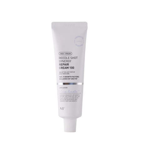 VT Cosmetics - Reedle Shot Synergy Repair Cream 100 - atjaunojošs sejas krēms visiem ādas tipiem, tostarp jutīgai ādai. Tam ir bagātīga formula, kas nodrošina nomierinošu un barojošu iedarbību. Tā sastāvā ir aktīvās sastāvdaļas ar atjaunojošu un nomierinošu iedarbību. keramīdi Lietotais stiprina ādas hidrolipīdu barjeru, savukārt peptīdi uzlabo tās tvirtumu un elastību. Centella asiatica ekstrakts un azulēns intensīvi nomierina kairinājumu un apsārtumu, bet pantenola pievienojums atbalsta reģenerācijas procesus. Produkts ir universāls un būs piemērots daudziem ādas tipiem, kam nepieciešama barošana un stiprināšana.